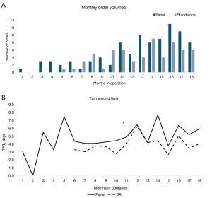 Within our own health system, an 11-gene pharmacogenomics panel (Table 2) was developed and deployed clinically in July 2023. Six months after the launch of the panel, a standalone assay for TPMT and NUDT15 was also made available. Over the course of months 7–18, standalone orders were placed with similar frequency as panel-based testing, averaging approximately 8 orders per month compared to 10 monthly panel orders towards the end of the observation period (Figure 2A). The median TAT for the pharmacogenomic panel was 4.5 days, ranging from 1 to 7 days, excluding the period impacted by reagent shortage (Figure S3). The standalone assay demonstrated faster TAT than the panel, with a median TAT of 3 days, typically released within 3–4 days of receipt in the laboratory (Figure 2B).