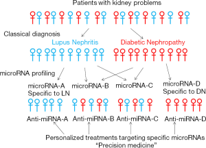Combinations of newly identified and known miRNAs may segregate patients more precisely to several groups even in single kidney disease and provide personalized treatments targeting specific miRNAs (Figure 1). On the other hand, some patients may be categorized in the same group by miRNA profiling even if they had different diagnosis (DN, DL or others) and the same treatment targeting common particular miRNAs may be effective to treat the patients who have been diagnosed as different kidney diseases (Figure 1). Changes in early stage may be an indicator of the initiation of kidney diseases. Some patients may need treatments even before the obvious symptoms such as proteinuria.