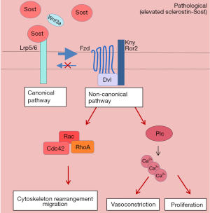 In SMC sclerostin elevation could lead to inhibition of the canonical Wnt pathway by binding to LRP5/6. This would activate the non-canonical pathway leading to migration and intracellular calcium increase. Increase of intracellular calcium is a very important signalling event which induces contraction of SMC (46). It has been shown that SMC isolated from the pulmonary artery of PH patients present higher intracellular calcium than SMC isolated from healthy lungs. This leads to increased susceptibility for SMC contraction which consequently translates for higher pulmonary vascular tone (46). Additionally, elevated intracellular calcium in SMC, is often associated to increased proliferative potential (Figure 2).