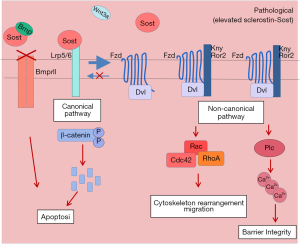 Sclerostin could also act on the EC of the pulmonary vessels. In this vascular cell type it could induce apoptosis by binding to LRP5/6 and inhibiting the canonical Wnt pathway. At the same time, as BMP has been shown to induce β-catenin activation, sclerostin would also block BMP-induced survival of EC. Additionally, similarly to SMCs, the blockage of the canonical pathway would lead to activation of the non-canonical pathway, affecting the cytoskeleton and intracellular calcium of EC leading to alterations of cell to cell contact and impairment of the barrier integrity of the endothelial layer (Figure 3).