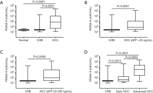 This study enrolled a cohort of 134 HBV-related HCC patients, 119 CHB patients, and 100 healthy individuals in the period from September 2016 to January 2017. The baseline demographic and clinical characteristics were summarized in Tables 1,2. Of the HBV-related HCC patients, the mean age was 54.5±11.8 years, which was significantly higher than 36.0±10.8 years for the 119 CHB patients (P<0.05), and 49.2±9.7 years for healthy individuals (P<0.05). In the HBV-related HCC group, the percentage of male was 85%, which was more dominant than 67% of male in the CHB group, and 51% in the normal group. Biochemical examinations at enrollment showed that levels of total protein, albumin, platelets and hemoglobin were significantly lower than those in the CHB and normal groups (P<0.05), while serum levels of aminotransferases (ALT and AST) and bilirubin (total bilirubin, conjugated bilirubin, and unconjugated bilirubin) were significantly greater compared with the other two groups (P<0.05). Based on the serum levels of AFP, the HBV-related HCC patients were subdivided into three subgroups: AFP <20 ng/mL (n=49, 36.6%), AFP 20–200 ng/mL (n=25, 18.6%), and AFP >200 ng/mL (n=60, 44.8%). In addition, the stages of the HBV-related HCC patients were evaluated according to the Barcelona Clinic Liver Cancer (BCLC) classification system, that were distributed among the following subgroups: stage 0 (n=15, 11.2%), stage A (n=27, 20.1%), stage B (n=42, 31.3%), and stage C (n=50, 37.4%). The male patients in the advanced HBV-related HCC (n=83, 90.2%) were predominant compared with those in the early stage HBV-related HCC (n=31, 73.8%) (P<0.05). Tumor size in the early stage HBV-related HCC patients was smaller than that in the advanced stage HBV-related HCC patients (P<0.001) with 19 (45.2%) patients in the early stage HBV-related HCC had a tumor size in diameter less than 2 cm, whereas 90 (97.8%) patients in the advanced stage HBV-related HCC had a tumor diameter greater than 2 cm. A majority of patients (n=31, 73.8%) in the early stage HBV-related HCC group had a single tumor in contrast to more than half of patients (n=50, 54.4%) in the advanced stage HBV-related HCC had multiple tumors. In addition, portal vein thrombosis, intrahepatic or distant metastases were more frequently occurred in the advanced stage HBV-related HCC versus the early stage HBV-related HCC.