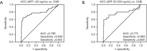 | HCC (AFP 20–200 ng/mL) vs. CHB | |||||