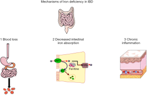 Absolute ID in patients with IBD could be due to increased loss and decreased intakes of iron: continuous or recurrent blood loss from the bowel and reduced iron intake, and limited iron absorption from the digestive system. Moreover, chronic inflammation should be associated with increased hepcidin, leading to a functional iron deficiency associated with absolute iron deficiency.
