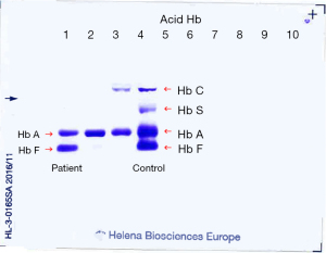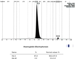 The sample was sent to the haematology department for Hb variant analysis and identification. Automated investigation techniques included the HPLC analyser (Bio-Rad Variant II) which uses the principle of cation exchange HPLC for the separation and determination of the relative percentages of normal and variant haemoglobins, as well as the CE instrument (Sebia Minicap Flex Piercing) for the separation and quantitation of haemoglobin subtypes in alkaline buffer. Additional manual techniques including the electrophoretic separation of haemoglobins in an acid buffered agarose gel and isopropanol stability testing were used to characterise the variant further.