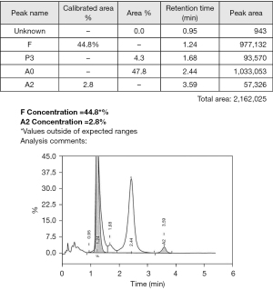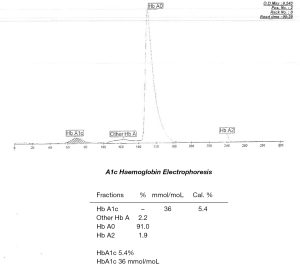 Cation exchange high performance liquid chromatography (HPLC) (Bio-rad D-100) showed an elevated HbA1c peak of 53.88% (565 mmol/moL) (Figure 1). However, when analysed by HbA1c capillary electrophoresis (CE) (Sebia Capillarys 2 Flexi Piercing), the electropherogram showed a normal HbA1c result of 5.4% (36 mmol/moL) with no variant peaks (Figure 2). This disparity triggered suspicion of a Hb variant co-eluting with Hb A in the CE method. As such, a total glycated haemoglobin by latex agglutination (Siemens DCA Vantage) was obtained which gave a result for HbA1c of 3.6% (15 mmol/moL), this was supported by an enzymatic assay (Abbott Architect) result of 3.8% (18 mmol/moL).