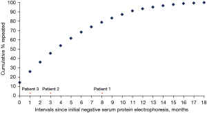 Serum protein electrophoresis was repeated once in 144 (90.0%) subjects, twice in 12 (7.5%) individuals and three times in four (2.5%) patients. Between the initial (negative) and repeat requests for serum protein electrophoresis, about two-thirds of the repeats were performed within the first six months of the initial test (Figure 1).