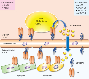 Recent reviews summarized the regulatory mechanisms of intravascular lipolytic processing of TRLs by LPL along the luminal surface of capillaries (11,24). LPL activity is tightly regulated at the transcriptional, post-transcriptional, translational, and post-translational levels because of its critical role in lipid homeostasis (25,26). Several proteins, including apolipoprotein (apo)C1 (27,28), apoC2 (29), apoC3 (28,30), apoA5 (31), angiopoietin-like protein 3 (ANGPTL3) (32), ANGPTL4 (33,34), and ANGPTL8, regulate LPL (35). LPL is synthesized and secreted as a monomer rather than a homodimer from head-to-tail (36,37). To preserve its native fold, LPL must be chaperoned in all compartments because it is inherently unstable (38). LPL is chaperoned in the endoplasmic reticulum by lipase maturation factor 1 (LMF1) and Sel-1 suppressor of Lin-12-like 1 (Sel1L) during parenchymal cell biosynthesis. LPL is chaperoned by heparan sulfate-modified syndecan-1 (SDC1) as it moves from the trans-Golgi network into the secretory pathway (39). Heparan sulfate proteoglycans (HSPGs) in the extracellular matrix and the glycocalyx of parenchymal cells regulate LPL in the subendothelial space. GPIHBP1 transports LPL from the abluminal endothelial surface to its site of action in the capillary lumen (11,40-42). GPIHBP1, an effective chaperone for LPL, maintains its native and active states (43). The acidic domain increases the rate of GPIHBP1 and LPL association by 2,500-fold, allowing LPL to transition from an HSPG-bound to a GPIHBP1-bound state and then enter the capillary lumen via transcytosis (44). LPL is stabilized by binding to TRLs; however, apoC1 and apoC3 displace LPL from lipid droplets (LDs) (26). Angiopoietin-like protein (ANGPTL)-3, -4, and -8 inhibits LPL activity by converting stable LPL dimers to unstable monomers. By binding directly to LPL monomers, ANGPTL4 catalyzes the irreversible unfolding of LPL’s α/β-hydrolase domain (37,38,44,45). GPIHBP1 binding to LPL prevents this inhibition. An ANGPTL3/ANGPTL8 oligomeric complex regulates LPL activity in oxidative tissues (46-51). Therapeutic strategies that improve LPL function, decrease apoC3 and ANGPTL4 function, or increase apoA5 function are expected to have cardioprotective effects (26). Genetic alterations affecting LPL activity are summarized by Shaik et al. LPL activity is elevated by loss of function of apoC3, ANGPTL3 and ANGPTL4 and decreased by loss of function of apoA5 (2,3) (Figure 1).